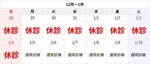 年内は12/27(土)まで、新年は1/5(月)より通常診療です。