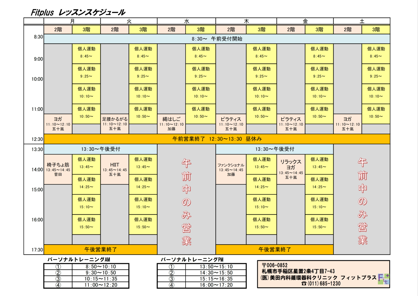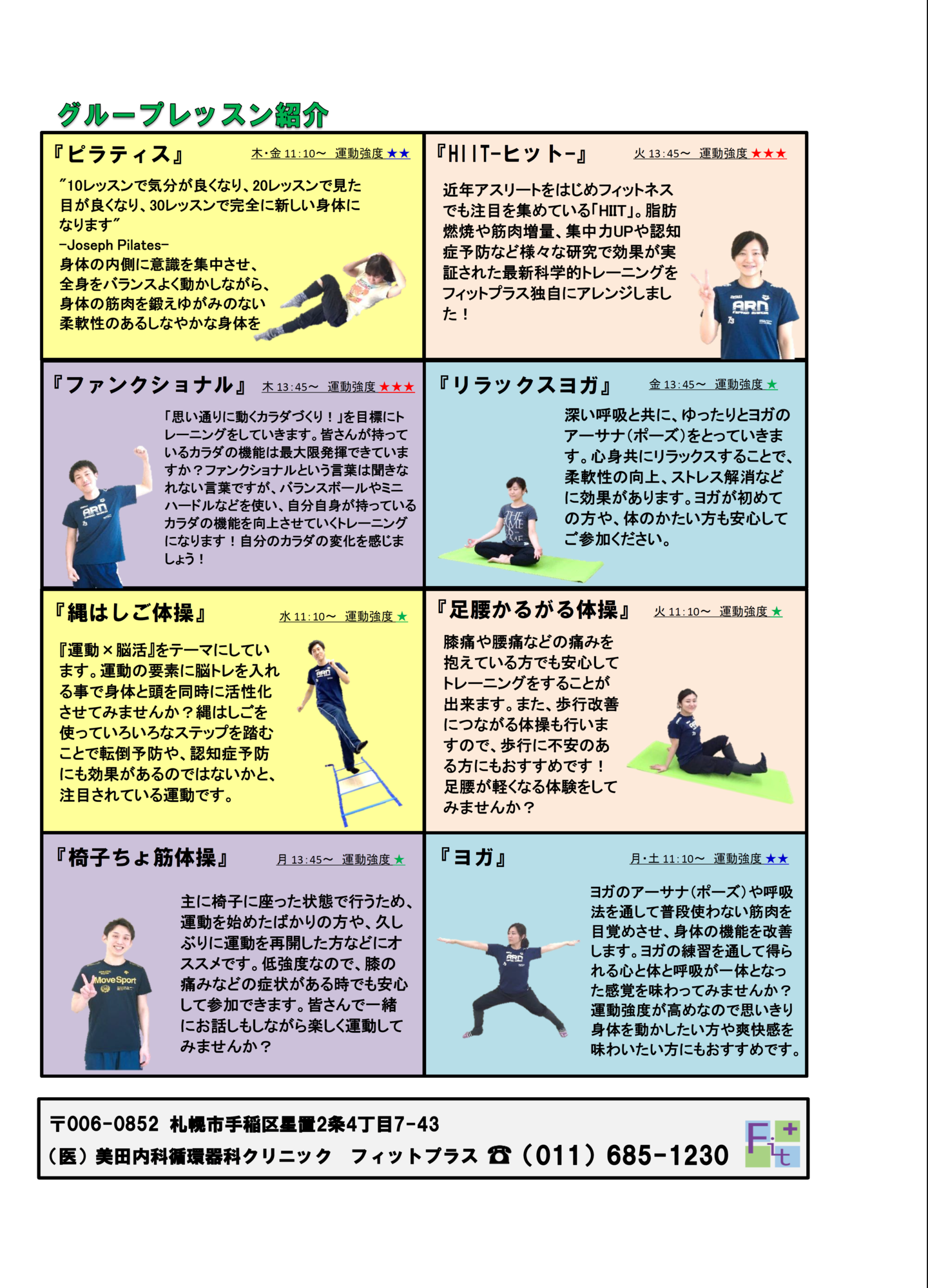 私たちはこれまで運動療法を通して、検査値の改善や体調の改善などの喜びを感じ、運動が生活になくてはならないものになった患者様を多く見てきました。これからもたくさんの方に運動の素晴らしさを実感してもらい、ご自身の身体と向き合ってほしい、大切にしてほしい。そんな思いからFitPlusは生まれました。FitPlusでは一人ひとりに合った運動プログラムを作成・指導いたします。体操教室も新たにクラスが増え、都合のよい曜日の教室に参加が可能になります。患者様にとってより運動を継続しやすい環境が、FitPlusにはあります。