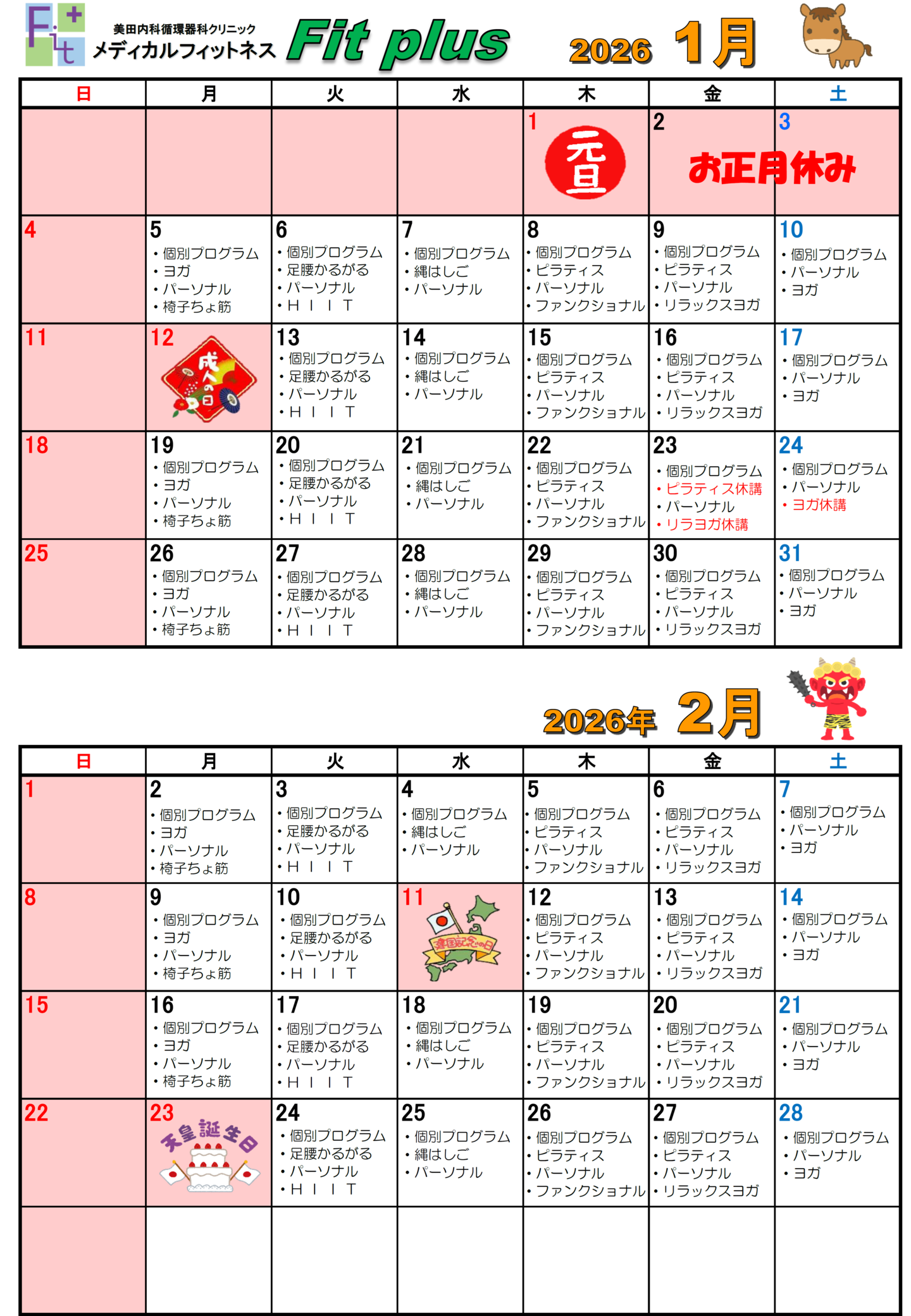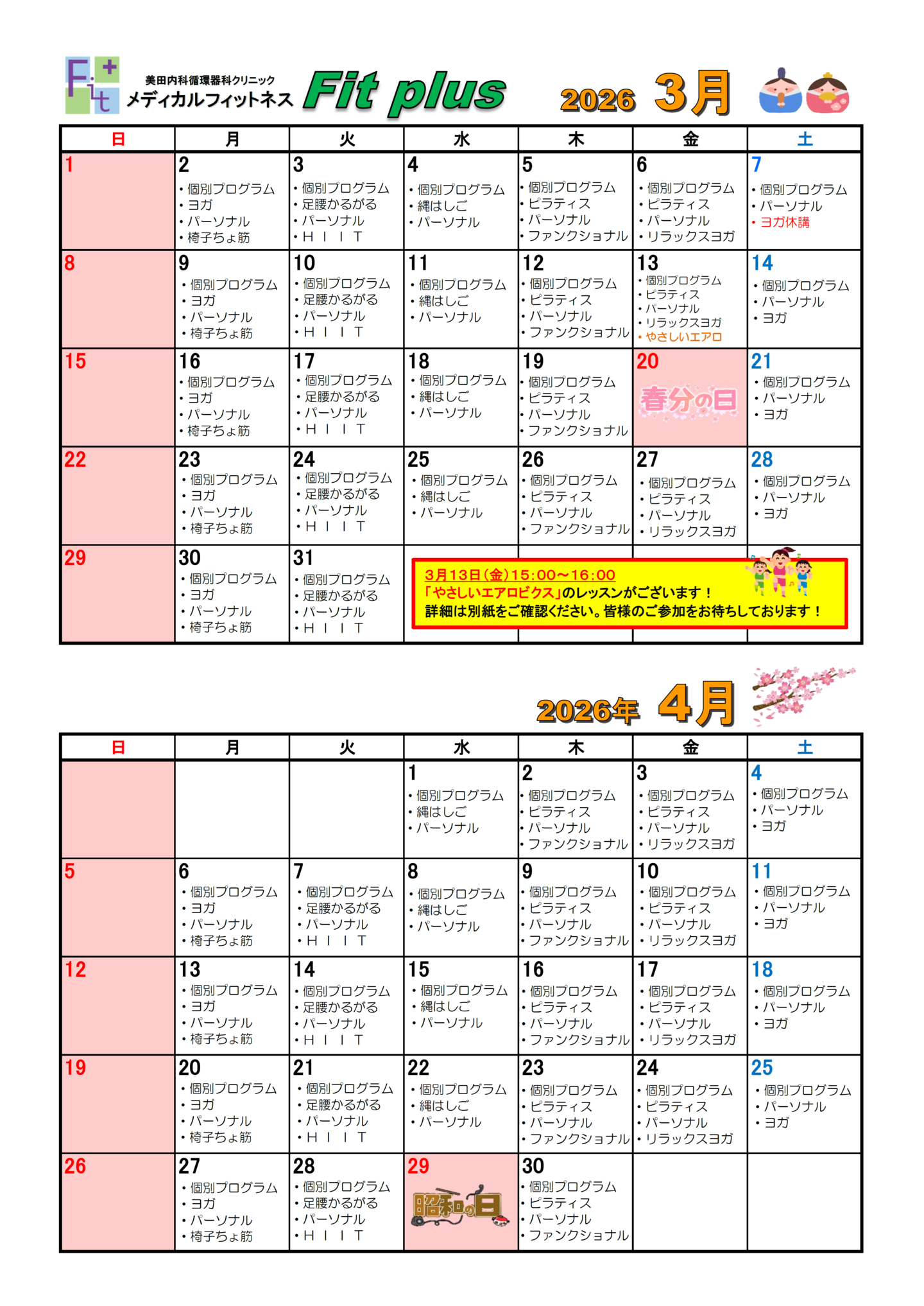 私たちはこれまで運動療法を通して、検査値の改善や体調の改善などの喜びを感じ、運動が生活になくてはならないものになった患者様を多く見てきました。これからもたくさんの方に運動の素晴らしさを実感してもらい、ご自身の身体と向き合ってほしい、大切にしてほしい。そんな思いからFitPlusは生まれました。FitPlusでは一人ひとりに合った運動プログラムを作成・指導いたします。体操教室も新たにクラスが増え、都合のよい曜日の教室に参加が可能になります。患者様にとってより運動を継続しやすい環境が、FitPlusにはあります。